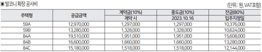 발코니 확장비는 모든 평형 1천만원이 넘으며, 계약 시 10% 납부하고 중도금 10% 지불한 후 잔금 80%는 입주지정일에 납부합니다. 84A 확장비는 무려 1천 9백만원으로 거의 2천만원 가까이 됩니다.