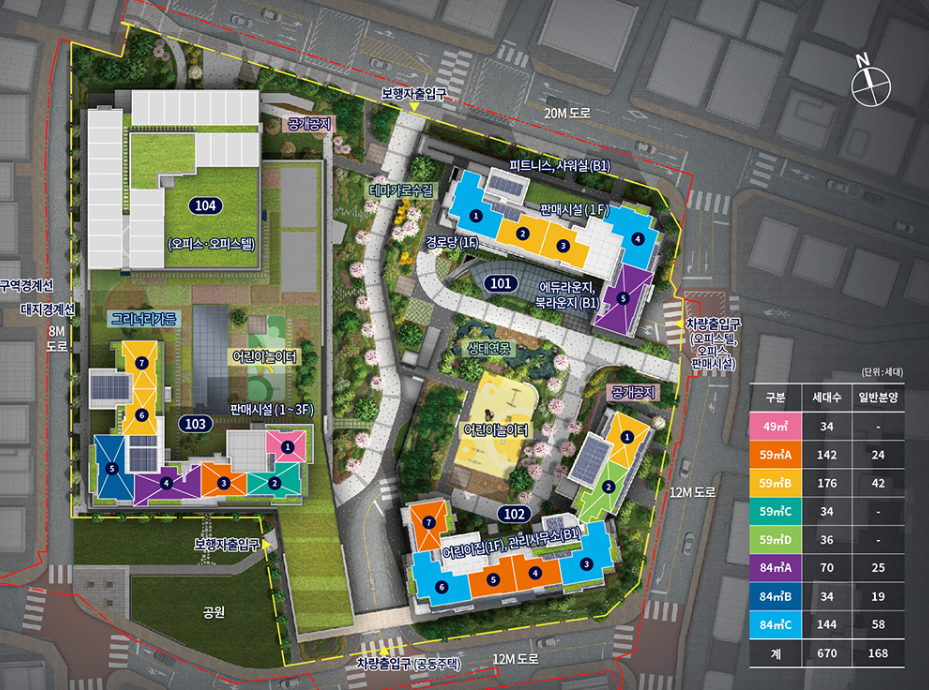 세대수가 많지 않고 층수가 높아서 단지 자체는 크지 않지만 어린이놀이터는 2개소가 구성되어 있네요. 104동은 오피스와 오피스텔로만 구성되어 있습니다.