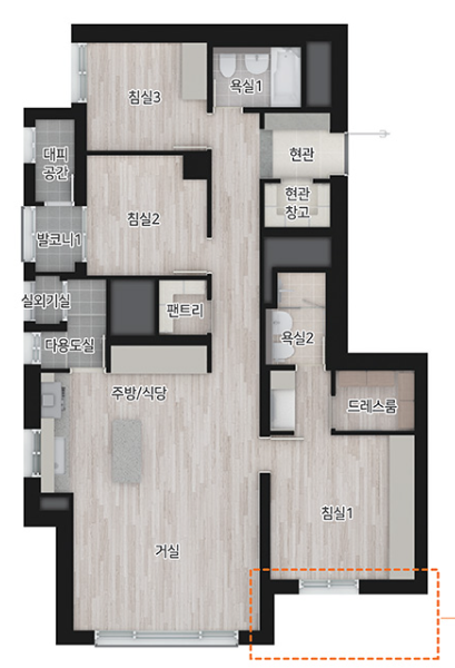 84A는 판상형 84B와 84C는 타워형입니다. 주황색 네모 표시된 부분은 3층부터 19층까지 홀수층 세대에게 제공되는 개방형 발코니 공간이라고 합니다. 84A는 드레스룸 쪽, 84B는 침실1쪽, 84C는 침실3쪽에 개방형 발코니가 만들어지네요. 개인적으로는 안방에 생기는 84B가 가장 좋아 보이네요.