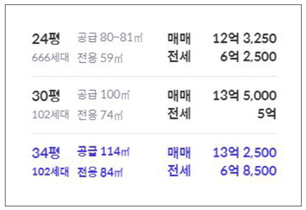 - 59A 타입: 최저 9억 5천 3백 5십만원 (1층) ~ 최고 10억 2천 6백 5십만원
