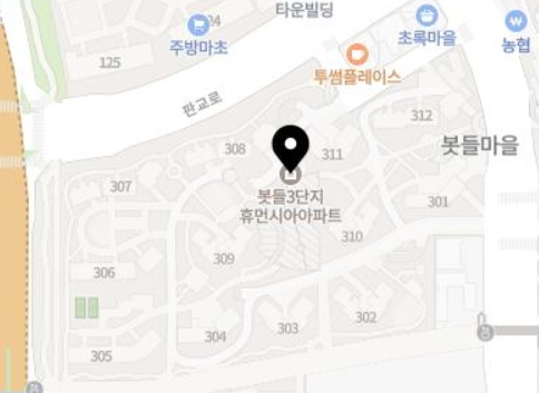 위의 단지배치도를 보시고 해당 세대들의 위치를 대략적으로 파악해 보시길 바랍니다. 아래에는 지도를 첨부해 드립니다. 봇들마을 3단지는 핑크색 네모, 초등학교(송현초등학교)는 파란색 동그라미로 표기하였습니다. 판교역은 남쪽으로 더 내려가면 위치하고 있습니다.