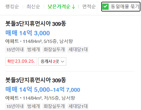 84타입이 74타입보다 낮은 매도가로 제시되어 있는데 74타입이 호가로 올려놓은 것 같습니다. 물론, 근처 부동산에 전화해 보면 네이버에 등록되지 않은 급매물들도 있을 것입니다.