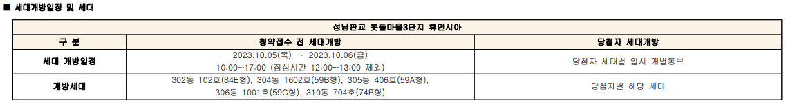 누구든지 확인 가능한 날짜는 2023년 10월 5일 목요일부터 10월 6일 금요일까지(10:00 ~ 17:00)이며, 일분의 세대만 개방하므로 위 표에 나온 동호수 및 평형을 확인하시길 바랍니다.