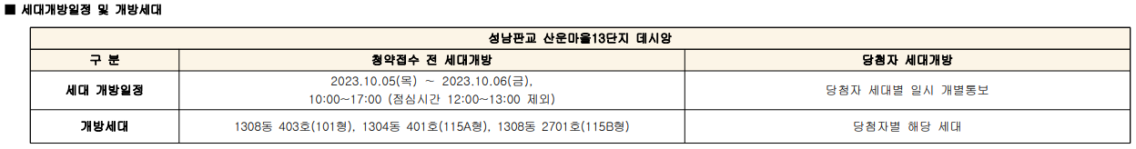 누구든 세대 내부를 확인 가능한 날짜는 2023년 10월 5일 목요일부터 10월 6일 금요일까지(10:00 ~ 17:00)이며, 일부 세대만 개방하므로 위 표에 나온 평형 및 동호수를 확인하시길 바랍니다.