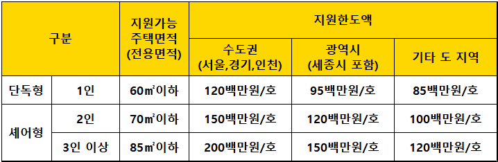 1인이 사용하는 단독형의 경우 전용면적 60㎡ 이하까지만 지원이 가능합니다. 전세보증금 지원한도액은 수도권에서는 1.2억 이하, 광역시는 9500만원 이하, 그 외 기타 지역은 8500만원까지만 지원이 가능합니다. 2인이 사용하는 셰어형의 경우 전용면적 70㎡ 이하까지만 지원이 가능하고, 전세보증금 지원한도는 수도권은 1.5억, 광역시는 1.2억, 그 외 지역은 1억원입니다.